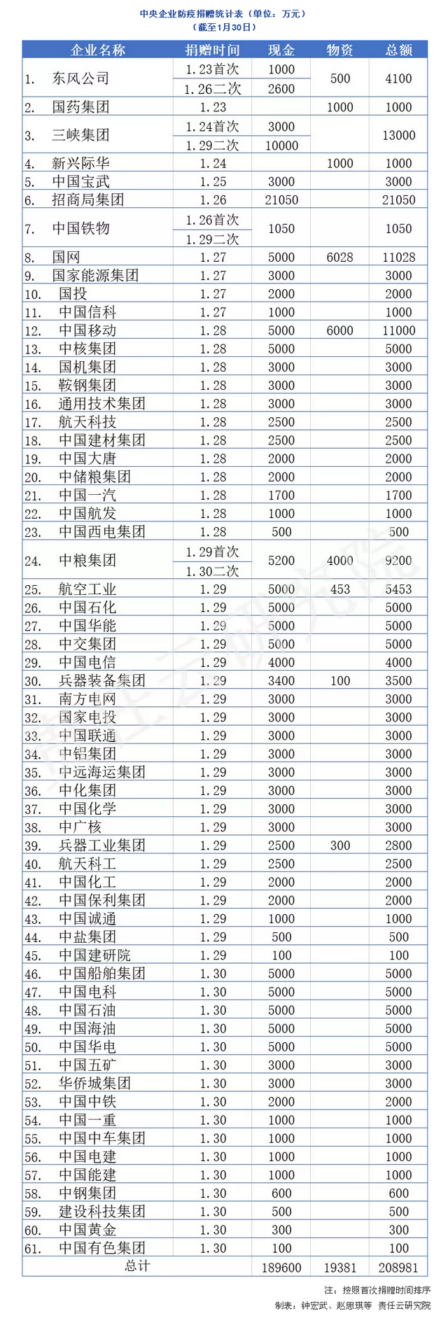 疫情发作后,东风公司、三峡集团、我国铁物以及中粮集团已建议两次捐款。