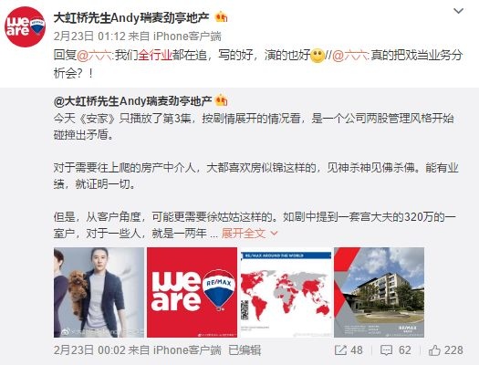 但业内人士对该剧的判断,似乎与诸多网友不同。毒眸(微信ID:youhaoxifilm)注意到,编剧六六在微博中转发了几位从业者对《安家》的评论,其中,@上海马员外 把看剧变成了业务分析会,在房似锦身上拆解出不少销售的门道,和上海房地产市场的现状;@大虹桥先生Andy瑞麦劲亭地产 则从徐姑姑身上,看到了服务中高端客户的房产经纪人的影子,并从诸多案例上认可了编剧六六下的功夫。