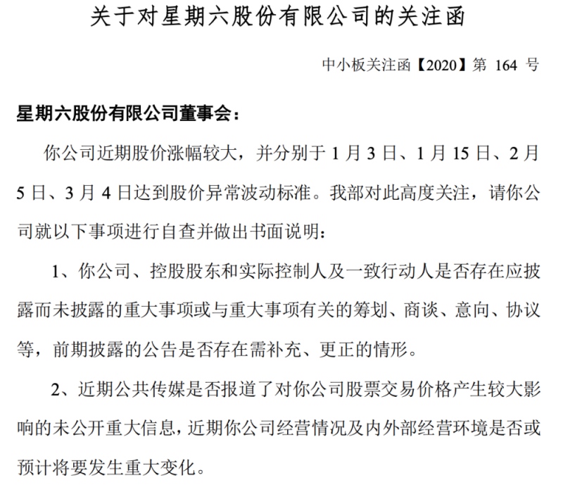 3月6日,深交所对星期六下发重视函,要求公司阐明是不是真的存在使用其他非信息发表途径自动投合“新零售”、“网络直播”等商场热门,进行公司股价炒作并合作股东减持的景象。