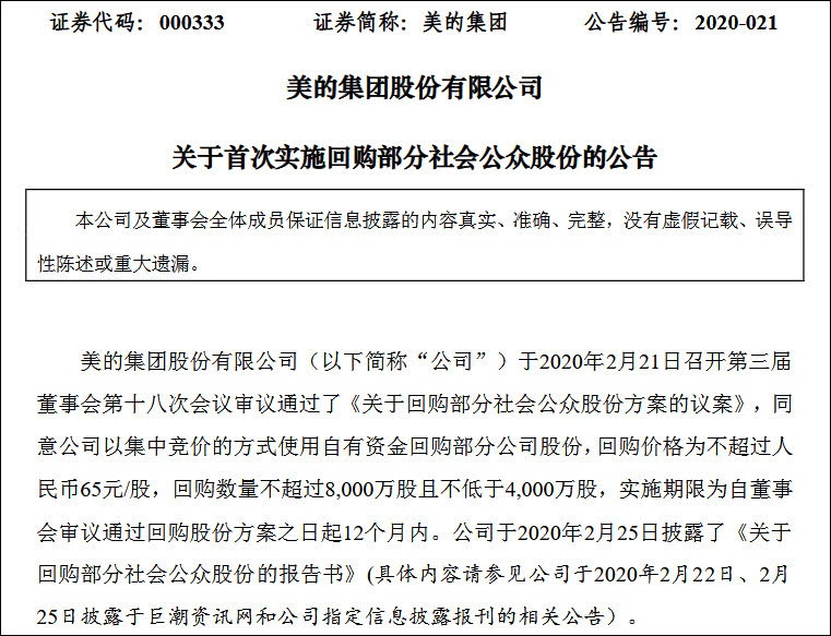 布告显现,美的集团于2月21日举行第三届董事会第十八次会议审议经过了《关于回购部分社会公众股份计划的计划》,赞同运用自有资金回购其部分股份,回购价格为不超越65元/股,数量不超越8000万股且不低于4000万股,回购期限为自董事会审议经过此项计划之日起12个月内。