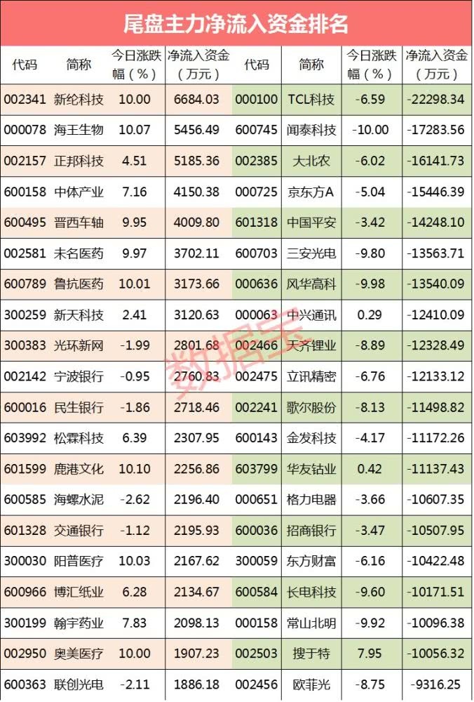 尾盘流出超亿元个股有19只,其间电子职业占7只。TCL科技流出2.23亿元居首,闻泰科技、大败农、京东方A流出超1.5亿元。