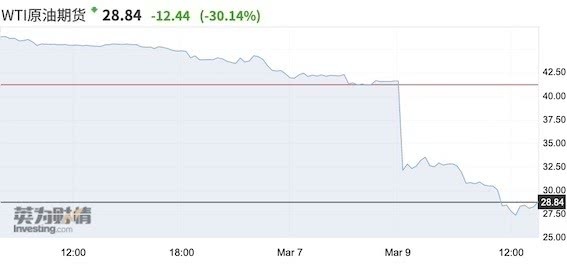 油价上星期五(3月6日)下挫10%后,3月9日再暴挫逾20%,布兰特及美国WTI油价别离跌至约35美元及32美元水平。