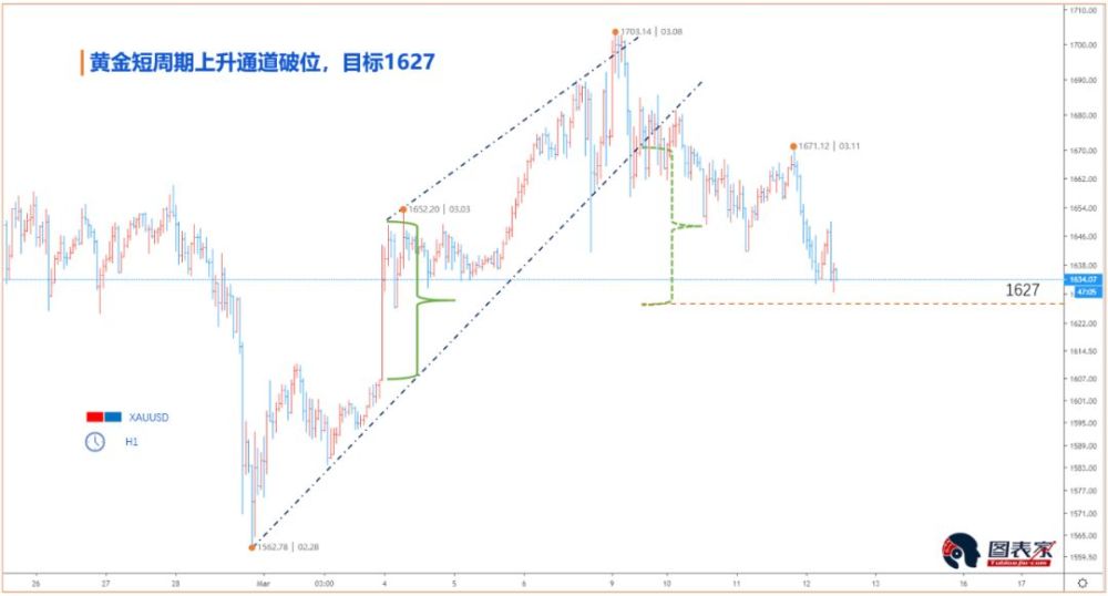 咱们在最近三天里更新了黄金小时图上的走势,以为短期黄金在1665方位跌破了上升通道,依据通点破位的计算方法,咱们咱们都以为价格会跌至1627.
