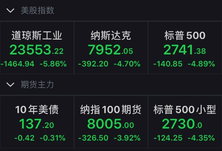 周三,美股收盘再度暴降。道指收跌1464.94点,跌幅近6%;标普500指数跌4.89%,纳指跌4.7%。个股方面,波音跌超18%,领跌道指;陶氏跌10.86%、联合技能跌9.93%,美国运通跌7.67%。