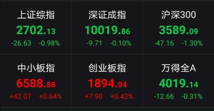 中新网客户端3月19日电(记者 谢艺观) 3月19日,A股收盘涨跌互现,沪指尾盘克复2700点,#深成指重回万点以上#。到收盘,沪指跌0.98%报2702.13点;深成指跌0.10%报10019.86点;创业板指涨0.42%报1894.94点。北向资金接连7日净流出,其间,沪股通净流出56.35亿,深股通净流出45.86亿。