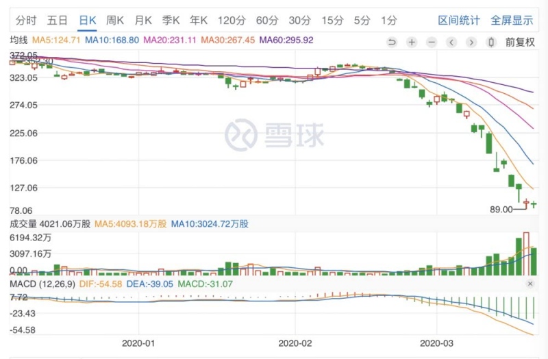 截止美国时间3月20日,波音公司(NYSE:BA)的股价已跌至95美元/股。这离今年2月12日的年内股价高点348美元/股才过去不到40天。其股价已累计下跌超过70%,总市值更是蒸发1358亿美元(约合人民币达9642亿元)至536亿美元。这相当于跌去中国南航、东航、国航三大航市值的4倍多。