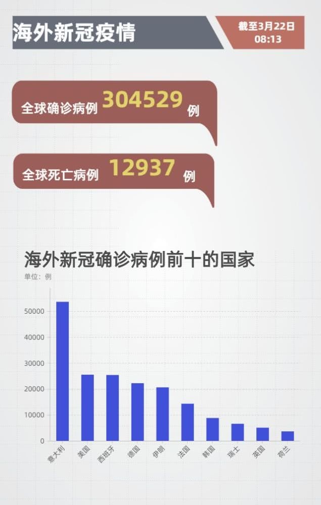 截至3月22日08:13,据约翰·霍普金斯大学发布的实时数据,全球新冠肺炎确证病例数达304529例,死亡病例数达12937例。海外确诊病例总数为223223例,其中,美国确诊病例数为25493例,仅次于意大利的53578例。