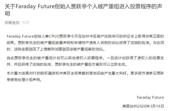 据悉债权人投票将与4月举办,假如成功,贾跃亭将成为在美成功进行破产重组的第一个中国人。