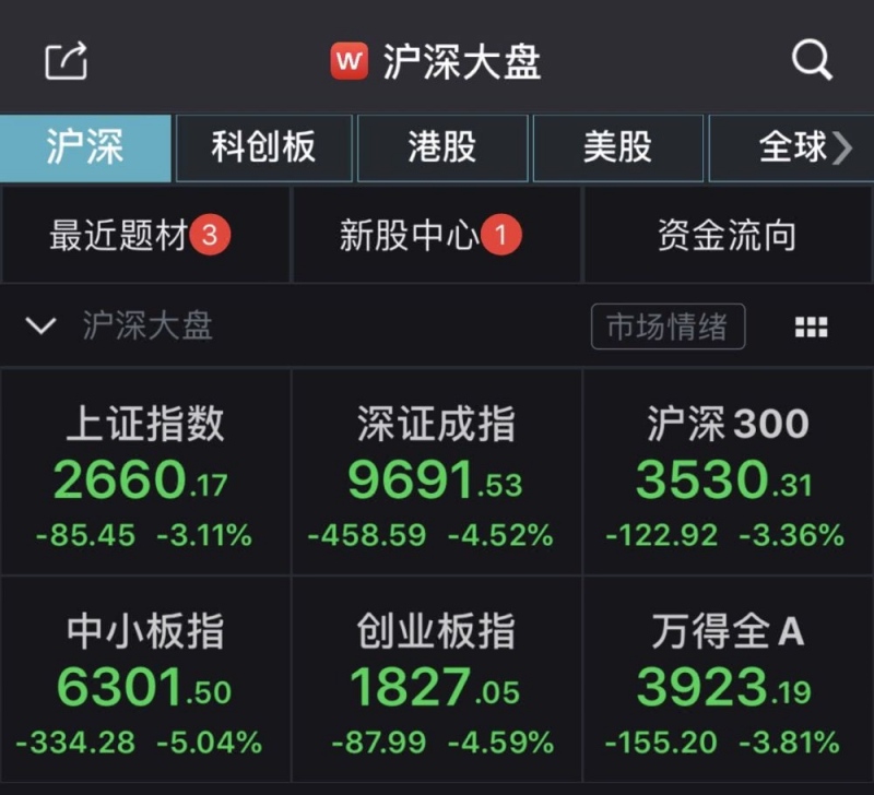 到收盘,沪指报2660.17点,跌幅3.11%,成交量2684.23亿元;深成指报9691.53点,跌幅4.52%,成交量4189.86亿元;创业板指报1827.05点,跌幅4.59%。