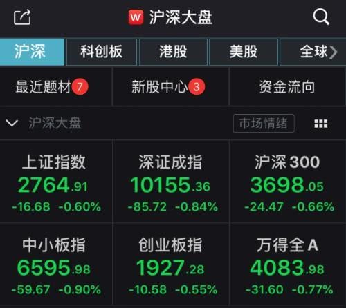 到收盘,沪指报2764.91点,跌幅0.6%,成交量2482.8亿元;深成指报10155.36点,跌幅0.84%,成交量3941.87亿元;创业板指报1927.28点,跌幅0.55%。