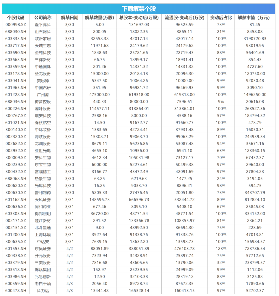 详细到个股,广州港、天风证券和瀚叶股份解禁数量居前,别离有47.50亿、14.86亿和11.46亿限售股解禁,占解禁前流通股份额为329.13%、63.17%、57.49%。以27日收盘价核算,下周解禁市值最大的为欧派家居,解禁股的市值到达319.07亿元。