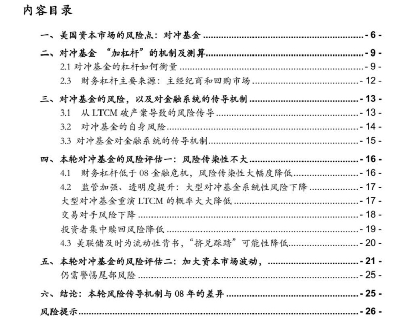 前言:上周我们深度研究了美国大型金融机构与08年情况对比,总体认为稳健,市场也有逐渐有了共识。市场仍然担心美国投资机构的风险,本文进行了分析,尤其是风险较高的对冲基金。对冲基金的财务杠杆是下降的,监管也是趋严的,对金融体系风险传染度不高;对冲基金的产品杠杆的是在提升的,从而加大长期资金市场的波动,会通过 “居民财富效应”传递风险。投资者更应关注美国经济的中长期风险,美国金融体系的短期风险总体可控。