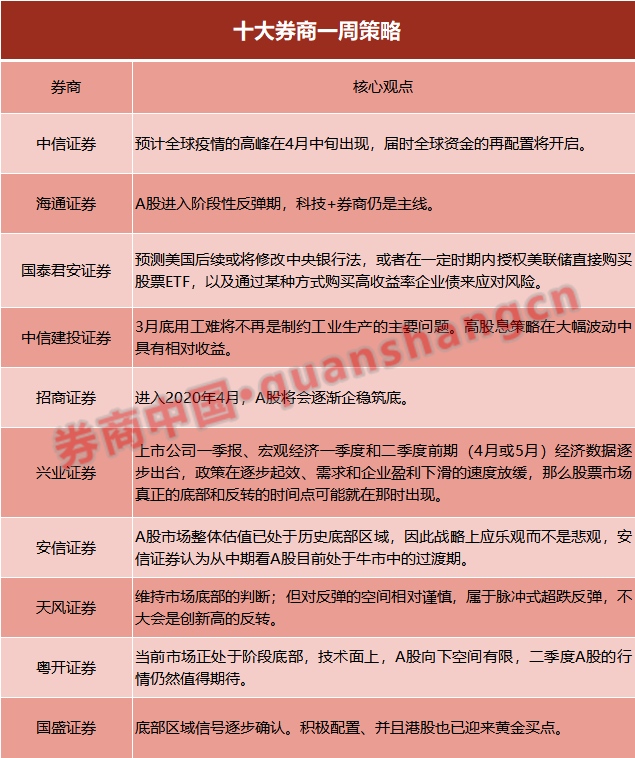 中心定论:①美联储无限量宽松缓解了流动性危机,G20携手抗疫,国内方针望加码,曙光微现,A股进入阶段性反弹期。②未来一段时刻全球抗疫仍处于困难期,商场反弹后还或许回撤,趋势性上涨还需等海外疫情拐点及国内基本面数据从头上升。③短期白马股和科技股均衡,中期转型方向的科技+券商仍是主线。