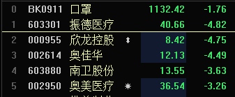 口罩概念全体跌幅一度近3%,到发稿时,跌幅有所收窄。个股方面,振德医疗、奥佳华、欣龙控股等跌超4%。