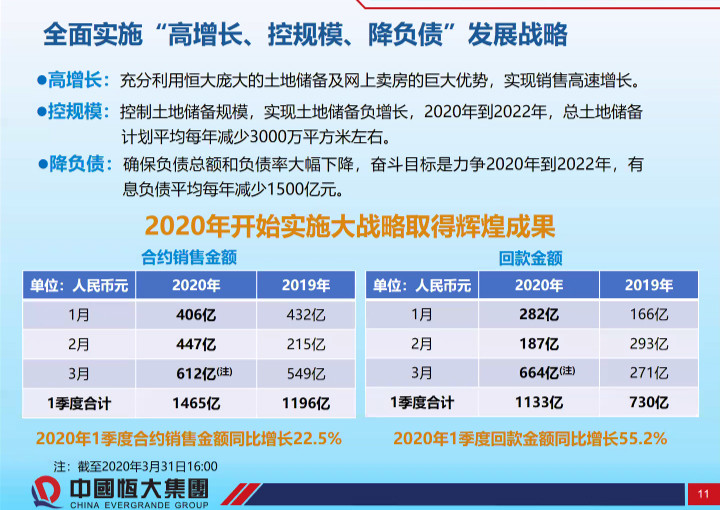 恒大称,从2020年起,将全面施行“高添加、控规划、降负债”发展战略。恒大集团董事局主席许家印表明,“高添加”便是要完成出售高速添加,本年要完成出售8000亿,到2022年要完成出售1万亿;“控规划”便是要严控土地储备规划,完成土储负添加,未来三年每年要下降3000万平方米左右,到2022年下降到2亿平方米左右;而“降负债”便是要把有息负债每年均匀下降1500亿,到2022年要把总负债降到4000亿以下。