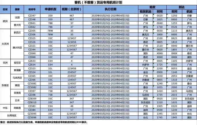 3月31日,南航发布公告称,为疏通货运物流途径,安稳世界供应链,满意社会需求,打通空中运送大动脉,注册客机(不载客)货运专用航班。按计划,自3月29日0时至4月15日24时,南航客机货运专用航班共注册28条,触及法国、意大利、新西兰、澳大利亚、日本等12个世界和区域。