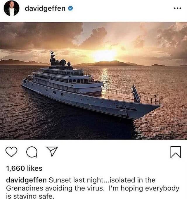 就在数以万计的民众寻求保护时,大卫·格芬在他耗资5.9亿美元购买的超级奢华游艇进步行“休假阻隔”。百亿富豪大卫·格芬在交际渠道写道,“昨夜的日落……在格林纳丁斯阻隔,为逃避这病毒。期望所有人都能安全。”并配出一张超级游艇在海中飞行的相片。
