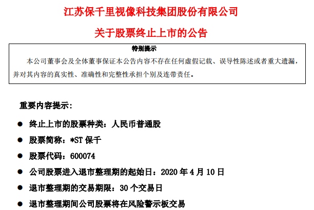 布告称,公司股票进入退市收拾期的开始日为2020年4月10日,买卖期限为三十个买卖日。如不考虑全天停牌要素,估计最终买卖日期为2020年5月26日。