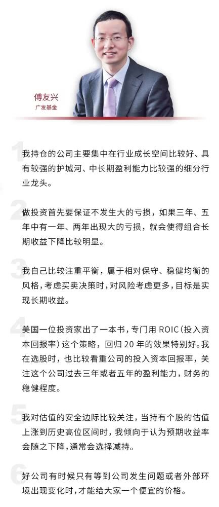 傅友兴我在选股时,比较看重这个公司过去三年或者五年的盈利能力,财务的稳健程度。其中一个重要的指标就是ROIC(投入资本回报率)。其实ROIC跟ROE差不多,只是它把财务杠杆统一化处理,对于不同财务杠杆的公司来说,有些公司账面资金比较多,用ROIC更为合理,能对不同行业的不同公司进行比较。当然,ROIC只是我关注的一个财务指标,我们还会从净现金流、资产负债率、净利率等维度看公司经营是否处于比较健康、良性的态势,将一些我们看不清楚或者财务表现不好的公司排除出去。