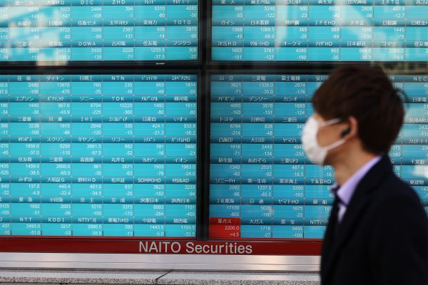 近来,在日本东京,一名佩带口罩的行人通过一处电子股指闪现屏。新华社