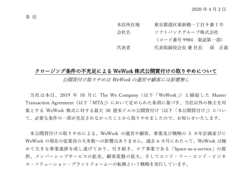 4月2日,软银集团股份有限公司(SoftBank Group Corp.)发布布告表明,因为某些条件不满意,该公司已停止了对至多30亿美元WeWork股份的收买要约,这些股票由其他大股东持有。