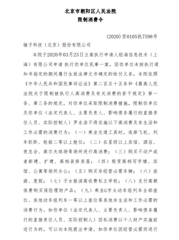 据天眼查信息显现,北京市向阳区人民法院于4月2日向锤子科技(北京)股份有限公司下发了“约束消费令”。“约束消费令”称:向阳区法院于3月23日立案实行了纽海信息技术(上海)有限公司请求实行你单位民事一案,因锤子科技未按实行通知书指定的期间实行收效法律文书确认的给付责任,该院依法对锤子公司采纳约束消费办法,约束锤子公司及单位(法定代表人、首要负责人、影响债款实行的直接责任人员、实践操控人)罗永浩,不得施行高消费及非日子和作业必需的消费行为。