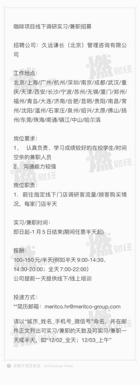 其实很难得看到咨询公司做项目是找上包工头、零门槛招社会兼职的。一般的咨询公司都是招在校生做PTA(兼职项目助理),厉害的咨询公司的PTA,不给工资都有人抢着干。去年11月25日,汇生还在招PTA做瑞幸项目,后面发现人手不够,只能开始招兼职。