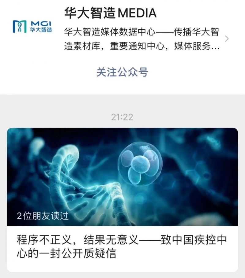 4月3日,华大智造在其官网发布了《程序不正义,成果无意义——致我国疾控中心的一封揭露质疑信》。