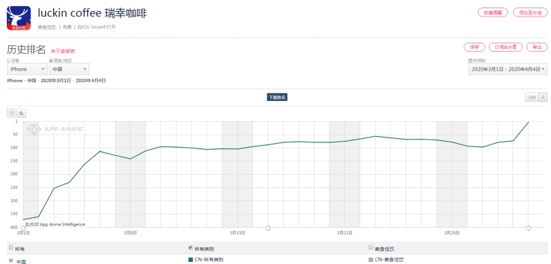 根据36氪从第三方数据公司App Annie取得的数据,自瑞幸4月2日供认财政造假事情以来,它的App下载量剧增,在中国大陆iOS抢手App下载排名从此前的70-100名之间,一天之内就上升70位,到达4月3日的第4名。而在3月初的时分,瑞幸App的名次还在350开外。原因是受到了疫情冲击,这与一切餐饮服务业企业相同。