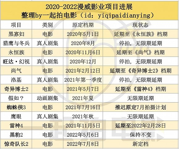 首要先重视最受内地观众重视的漫威电影的档期状况。与之前料想中的那样,漫威把从《黑寡妇》到《雷神4》的原定档期都拖延的一个身位,惋惜的是《尚气》无缘新年档。从数量来看,本年只要《黑寡妇》一部漫威电影世界著作,是2012年以来的最低产值,而加上《蜘蛛侠3》,下一年则有4部。2022年也有《雷神4》《黑豹2》《惊讶队长2》三部著作。而Disney+的漫威美剧,也由于拍照原因,无限期延期。