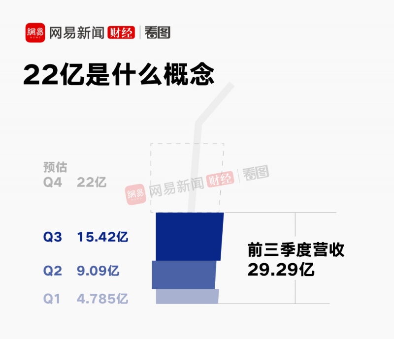 依照瑞幸咖啡此前发布的财报,其在2019年的前三季度的收入分别为4.785亿元、9.091亿元、15.42亿元。在第三季度财报中,瑞幸猜测,第四季度净营收估计在21亿到22亿元之间。