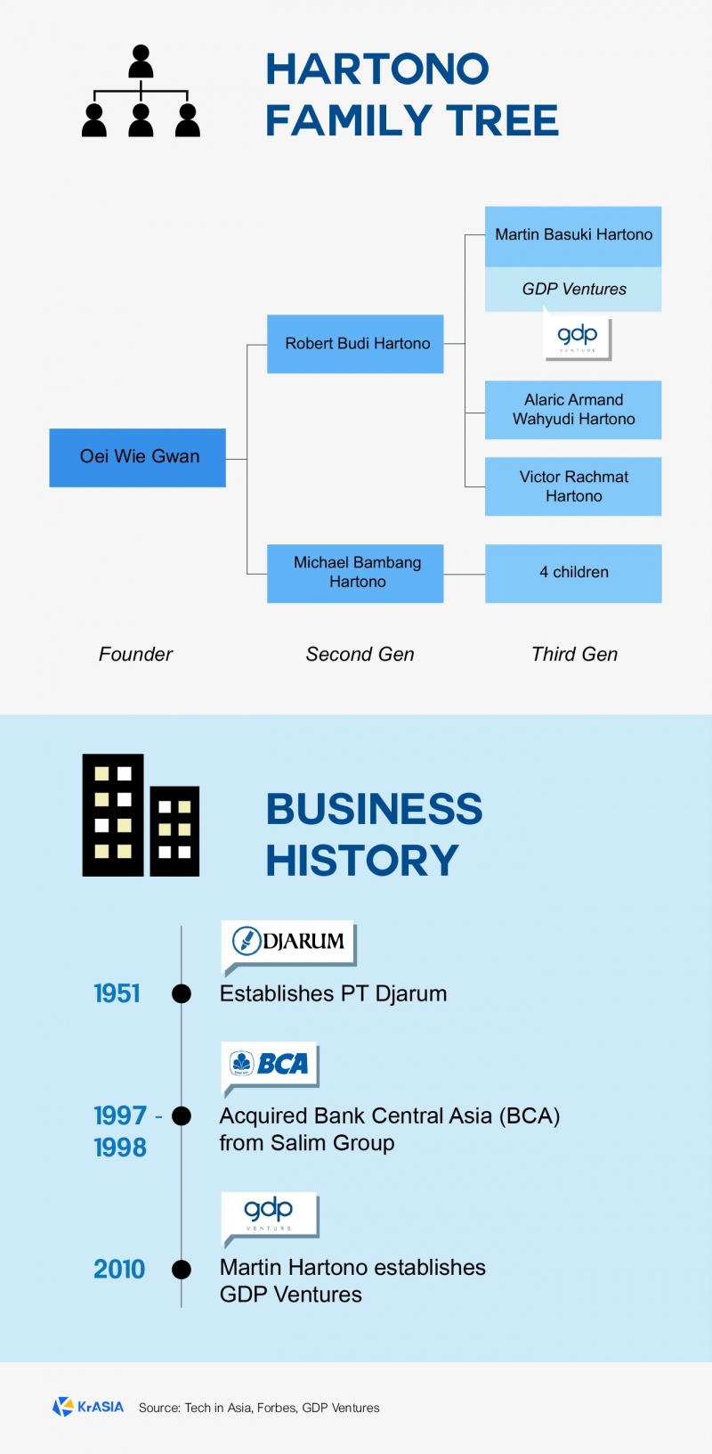 黄惠忠有三个儿子,其中 Martin Basuki Hartono 正带领家族开始为多个领域的初创企业投资。1998 年,在美国完成学业的 Martin 回到雅加达,加入了家族企业针记集团,担任技术总监。在接受媒体采访时,他总会谈到自己对技术的热爱。