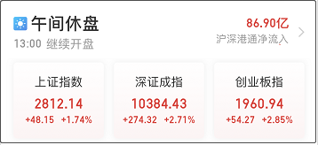 4月7日早盘,A股三大指数全线高开,随后震动走高。到午间休盘,沪指涨1.7%;深成指涨2.7%;创业板指涨2.8%,报收1960点。北上资金大幅净流入A股,沪股通净流入40.8亿,深股通净流入46.1亿。