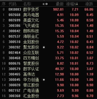 财联社4月7日讯,今天早盘,数字钱银概念股强势领涨,聚龙股份、四方精创、高伟达、飞天诚信、奥马电器、数字认证、海联金汇等全线涨停。