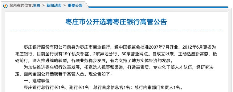 4月9日,汹涌新闻留意到,山东枣庄银行官网明显方位发布了一条揭露选聘高管的布告,布告的落款方为中共枣庄市委组织部,时刻为2020年4月3日。