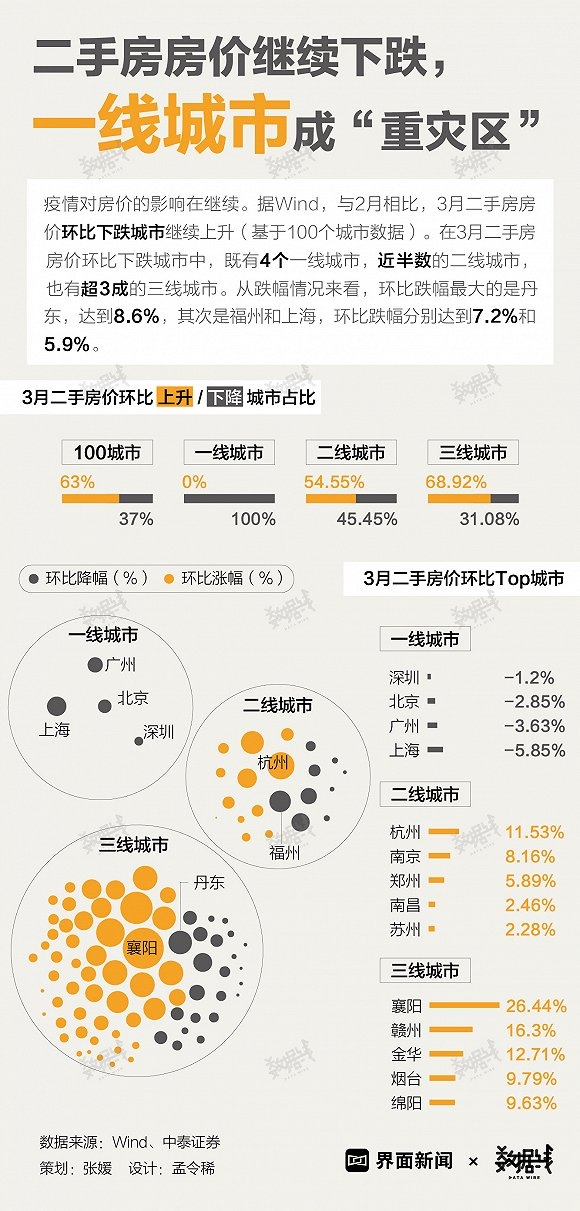 疫情对房价的影响在持续。据Wind,与2月比较,3月二手房房价环比跌落城市持续上升,这中心还包含4个一线城市,近对折的二线城市以及超3成的三线城市(根据100个城市数据)。从跌幅状况去看,环比跌幅最大的是丹东,到达8.6%,其次是福州和上海,环比跌幅别离到达7.2%和5.9%。