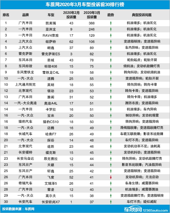车质网收到的8241条车主有用投诉信息中,丰田系车型机油增多、乳化问题到达936条之多,并占有榜单前三名。其间,广汽丰田凯美瑞投诉量为388条,环比增加超8倍,占有整个车质网第一方位。
