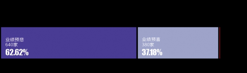 其间,成绩预喜(包含预增、略增、续盈、扭亏)的企业共380家,占比为37.18%;成绩预悲(包含略减、首亏、预减、续亏)的企业共640家,占比为62.62%;不确定2家。