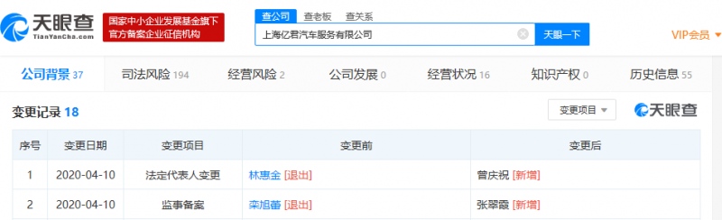 天眼查多个方面数据显现,4月10日,神州优车全资子公司——上海亿君轿车服务有限公司发作工商改变,林惠金卸职法定代表人,曾庆祝接任。