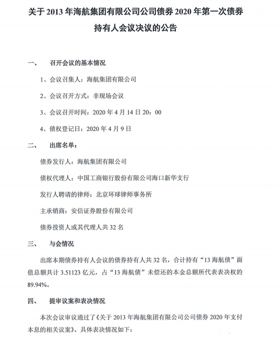 4月15日,海航集团布告称,“13海航债”2020年第一次债券持有人会议收效,审议经过本息递延付出方案,递延至2021年4月15日付出。