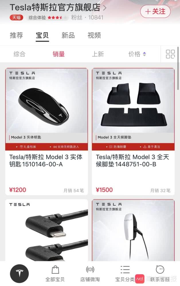 到记者发稿时,特斯拉天猫旗舰店卖得最好的是Model 3的实体钥匙,月销量为54笔,排名第二的是全天候脚垫,排名靠前的还有车载充电套件以及8000元的家庭充电包服务,价格与特斯拉的自有途径共同。