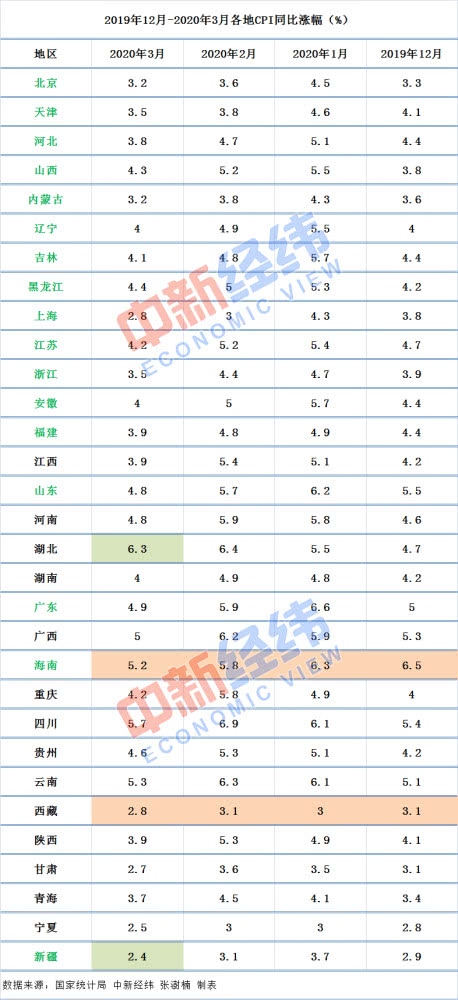 中新经纬客户端4月17日电 (张澍楠)31省份2020年3月CPI已悉数发布。中新经纬客户端注意到,10省份CPI同比涨幅超全国,湖北居首达6.3%;31省份同比涨幅均较上月回落,其间北京、天津、河北等17省份呈现连降。