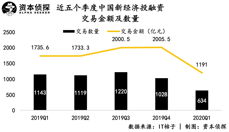 一级商场方面,依据IT桔子的数据,2020年Q1国内新经济一级商场共有投融资事情634起,同比下降44.5%;Q1投融资买卖金额共1191亿元,同比下降31.4%。