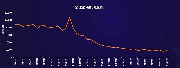 全球出港客运航班于3月16日抵达峰值,随后进入递减状况。在数据计算周期里,最低出港量仅占3月16日出港航班量的1/10。