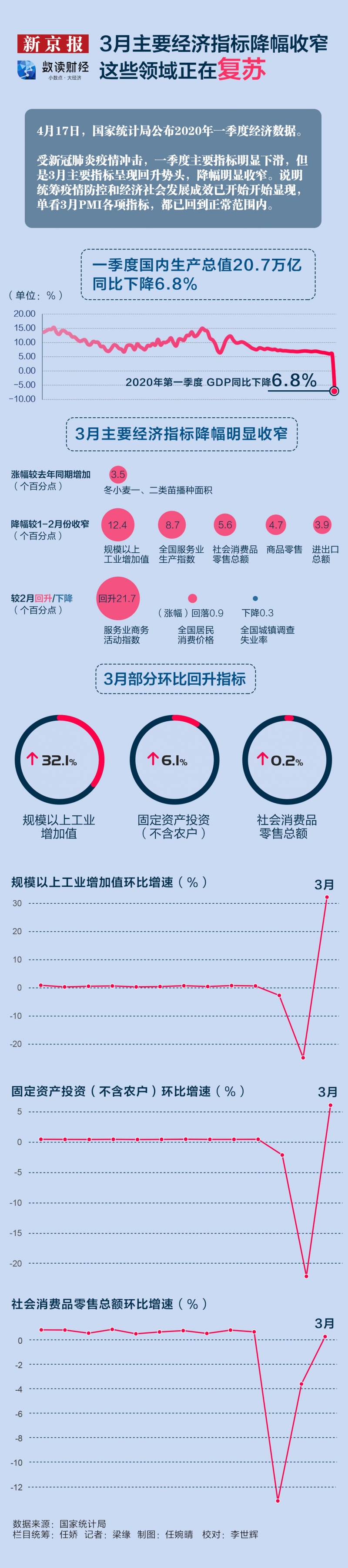 4月17日,国家统计局发布2020年一季度经济数据。 受新冠肺炎疫情冲击,一季度首要目标显着下滑,可是3月首要目标出现上升气势,降幅显着收窄。阐明统筹疫情防控和经济社会继续健康发展成效已开端闪现,单看3月PMI各项目标,都已回到正常范围内。