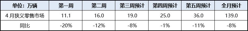 据流转协会调研,4月上旬湖北区域以外省份的经销商门店根本复工结束,但客流康复率为正常水平的70%,出售功率仅康复67%,到4月底估计能逐步康复。周度走势方面,车市前两周零售同比别离下降20%、12%,跟着终端出售的进一步康复,周度同比逐步提高,但第五周受去年高基数影响增速将有所滑落,估计在-11%左右。归纳可推算出4月零售估计完结139万辆。