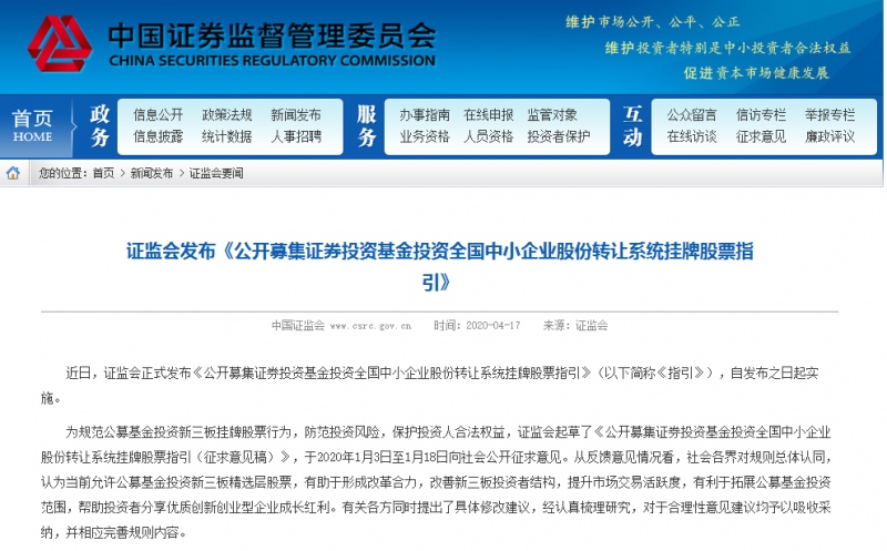 跟着新三板揭露发行和接连竞价事务体系正式上线,公募基金出资新三板商场的方针也落地了。证监会4月17日正式发布《揭露征集证券出资基金出资全国中小企业股份转让体系挂牌股票指引》(简称《指引》),清晰办理人要求和可参加出资的基金类型,规则基金的出资规划仅限于精选层股票。