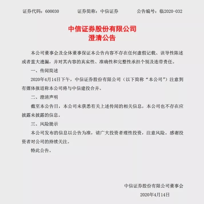 4月14日晚间,中信证券和中信建投快速发表布告,否定商场上风闻的兼并事情,一起两家公司均称不存在应发表未发表信息。