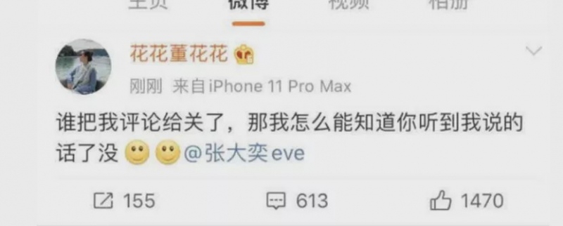 “花花董花花”榜首次发文不久,再次发文@张大奕eve,称微博谈论被关。