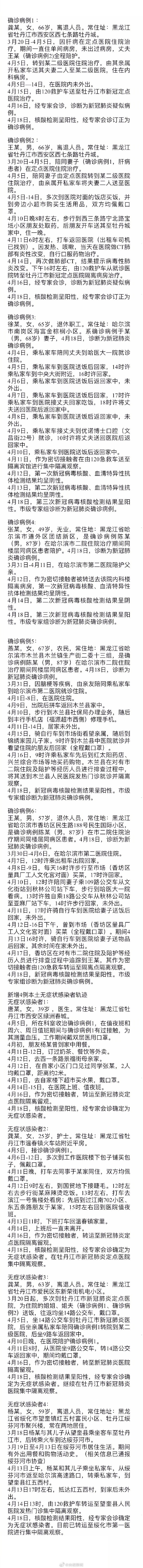 据黑龙江卫健委,2020年4月18日0-24时,黑龙江省内新增确诊病例6例(哈尔滨4例、牡丹江2例),新增无症状感染者4例(牡丹江3例、绥化1例),现将其举动轨道发布如下: